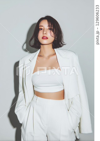 白いセットアップで魅せる洗練された女性 ─ クール&モダンなポートレート