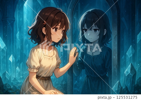 鏡の中のもう一人の自分と向き合う少女 ファンタジーイラスト
