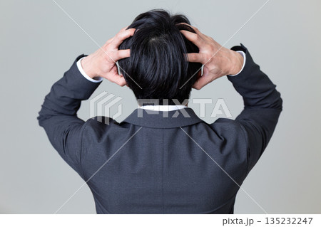 頭を抱えて悩むスーツ姿のミドル男性ビジネスマン