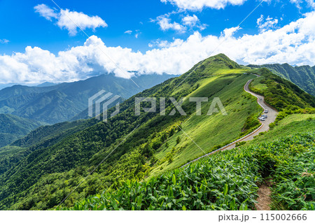 UFOラインと緑の笹原 秋の空 (高知県 瓶ヶ森林道)
