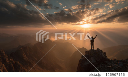 ドラマチックな空の下、夕暮れの砂漠に佇むひとりの男性のシルエット