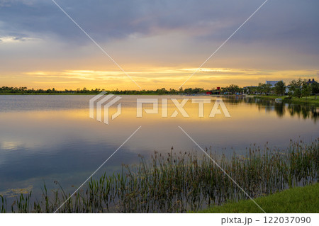 Evening landscape over lake water in southern tropical wetlands. Amazing Florida nature at sunset