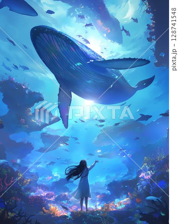 空を泳ぐクジラと少女が出会う、幻想的な海の世界のイラスト3