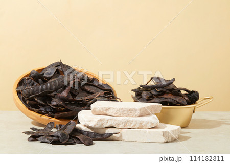Front view of three stones stacked on each other. A lot of black locust fruits displayed. Black Locust (Fructus Gleditschiae) very useful for nurturing healthy, soft, and beautiful hair
