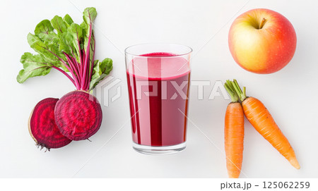 Brightly arranged apple, beetroot, and carrot elements showcase a nutritious detox juice with health benefits