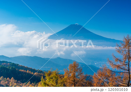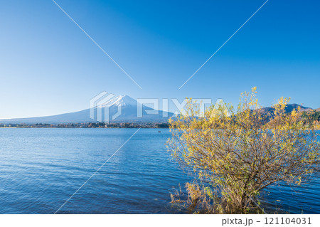 「山梨県」秋の富士山・河口湖湖畔の眺め