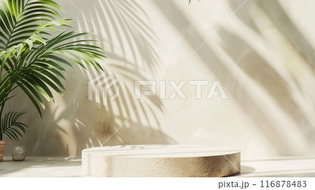表彰台テーブルのトップビュー、 日光の緑のヤシの木
