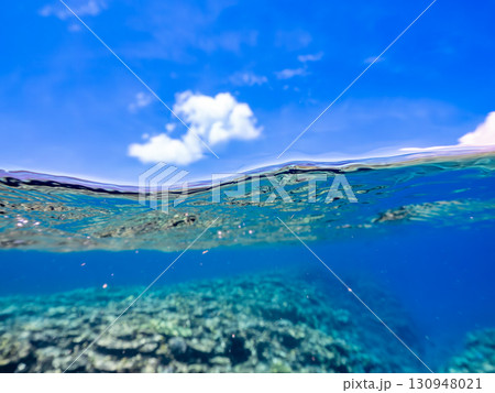 カタマランヨットのダイビングクルーズ船の半水面撮影。美しいサンゴ礁と熱帯魚の群れ。 沖縄県島尻郡慶良