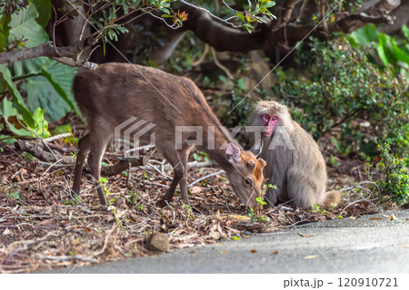 屋久島世界自然遺産の鹿と猿(8月)くつろぐヤクシカとヤクザル
