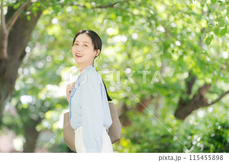 新緑の中を歩くビジネスウーマン