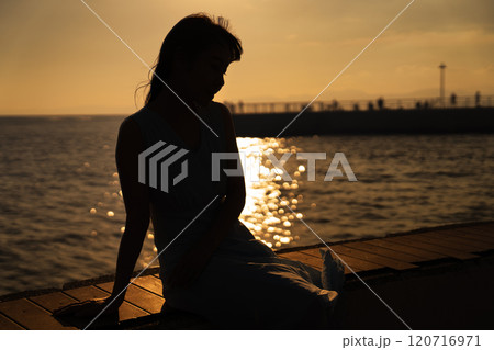 駿河湾の海の夕陽と一人旅女性のシルエット