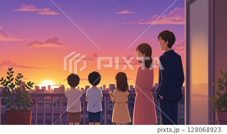 夕焼け空の下、家族の温かい笑顔が輝く特別な時間