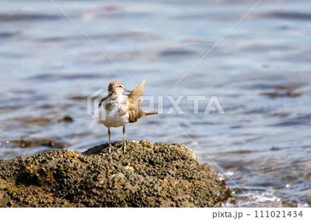 羽づくろいする美しいイソシギ(シギ科)。 日本国東京都大田区、東京港野鳥公園にて。 2023年10