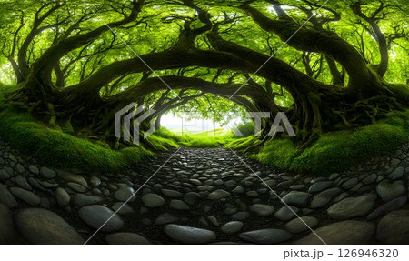 Enchanting Forest Pathway, A Mossy Stone Road Through a Verdant Canopy