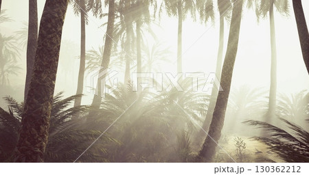 A tranquil tropical forest showcases tall palm trees shrouded in mist on a peaceful morning. Lush greenery envelops the area, creating a serene, mystical atmosphere.