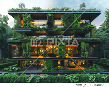 Modern green building with lush vegetation and open courtyard design. Ideal for concepts like sustainability, biophilic design, and eco-friendly architecture.