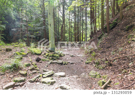 Forest hiking trail surrounded by trees and natural greenery at Oyama mountain, Isehara, Kanagawa, Japan