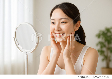 美容施術後にフェイスラインを確認する女性のセルフチェック