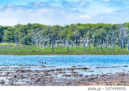 道東野付半島立で立ち枯れの木が並ぶナラワラの荒涼とした風景
