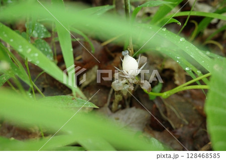 湿潤な杉林のスギゴケと一般的なキノコの姿をしたクロフチシカタケキノコの全身像(自然環境下マクロ)