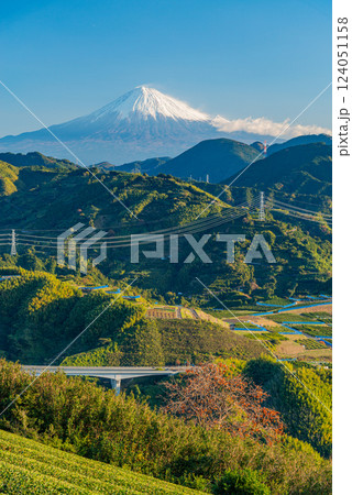 (静岡県)秋の茶畑越しに富士山