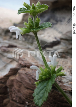 自然 植物 ヤンバルツルハッカ、九月の山原。海岸の岩場にへばりつくように茎を伸ばし花をつける