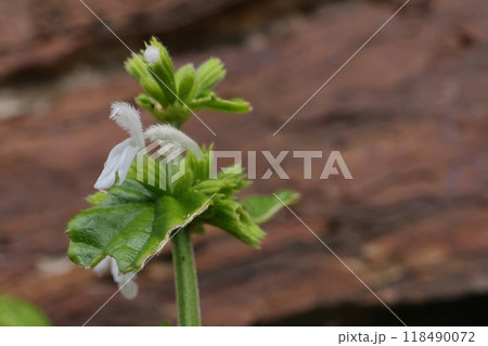 自然 植物 ヤンバルツルハッカ、シソ科の植物。鈍鋸歯を持つ丸い葉は対生、花は腋生で輪生