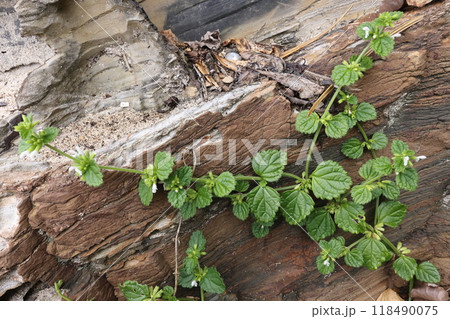 自然 植物 ヤンバルツルハッカ、海岸の岩場でへばりつくように伸びる茎。どんどん分枝して勢力を広げる