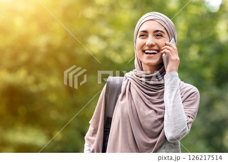 Happy muslim woman in hijab talking on mobile phone while walking by park