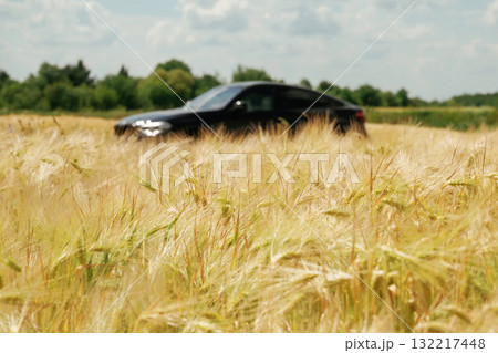 With smartphone in hands. Young girl is on the field at sunny daytime having nice weekend