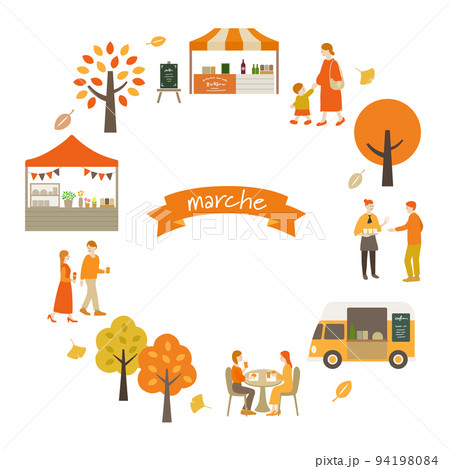 秋の紅葉とマルシェでにぎわう人々 背景素材