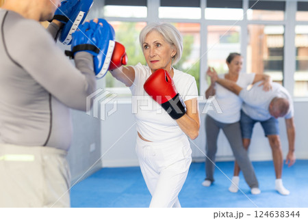 Old woman attendee of karate classes fighting with her opponent in sports hall