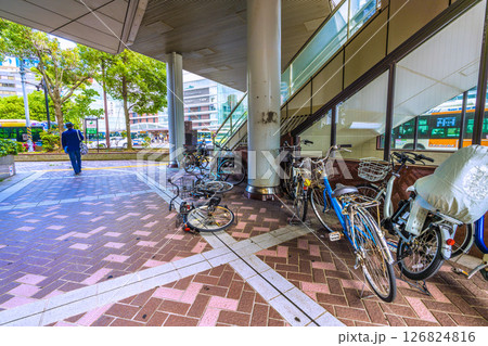 日本の横浜都市景観 強風…横浜駅西口、ビル風が強い「横浜西口第一歩道橋」の下、放置自転車が倒れていた