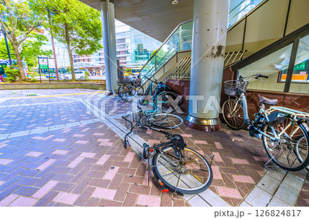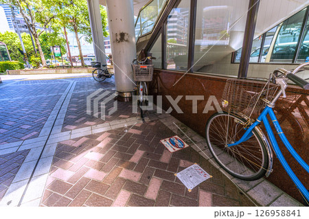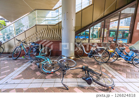 日本の横浜都市景観 強風…横浜駅西口、ビル風が強い「横浜西口第一歩道橋」の下、放置自転車が倒れていた