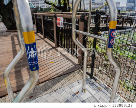 東京都市風景 歩行者用通路に設置された「自転車乗り入れ禁止」の看板