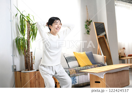 自室でトレーニングをする若い女性