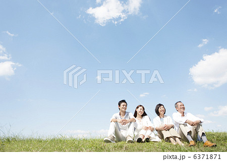 芝生に座る家族4人