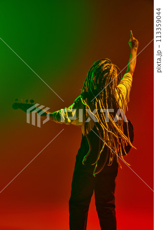 Lost ion the music. Back view of musician with dreadlock playing electric guitar, performing solo on stage against gradient red green background in neon light