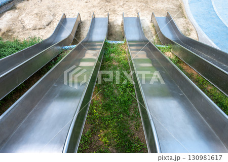 Visitors enjoy multiple slides at a playground on a sunny day