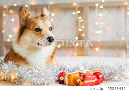 Corgi dog with gifts and Christmas decorations against the garland lights background. New Year and Christmas concept. Waiting for the holiday