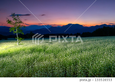 福島県南会津郡南会津町八総 舘岩地域の高杖原地区に広がるたかつえそば畑の白い蕎麦の花と夕焼け空