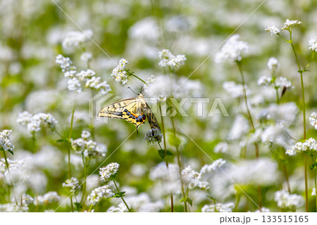 福島県南会津郡南会津町八総 舘岩地域の高杖原地区に広がるたかつえそば畑の白い蕎麦の花とアゲハチョウ