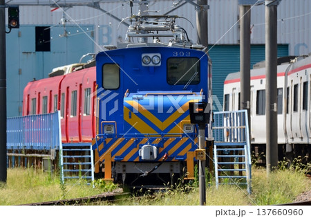 名古屋鉄道、舞木検査場で車輌入れ替え作業をするデキ300形電気機関車