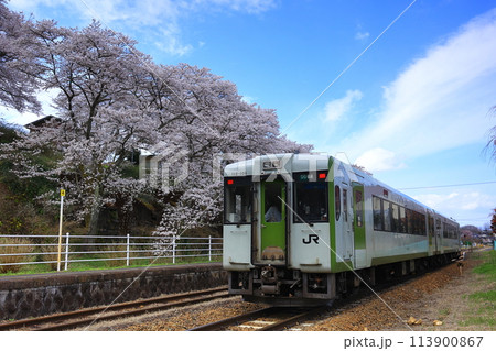 暮れ行く満開の桜の駅を発車するローカル線 キハ110