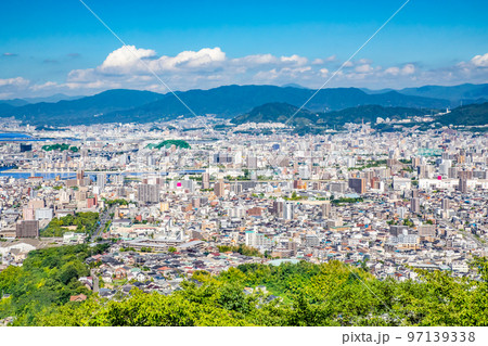 広島市西部の沿岸部を展望しています。江波皿山公園、江波山公園が見えます。佐伯区まで見えます。広島県