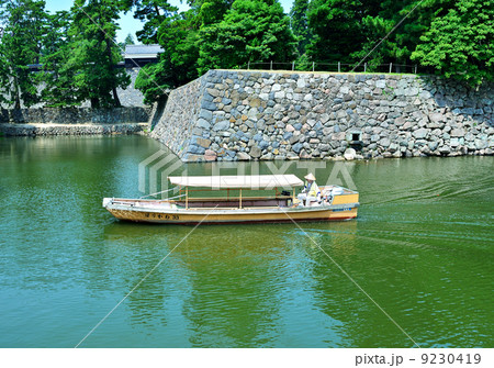 兵庫県姫路市 姫路城の内堀をゆっくりと進む和船の手漕ぎ舟と桜