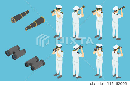 アイソメトリックイラスト:望遠鏡と双眼鏡(船員白制服)