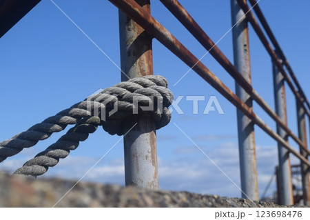錆びた鉄柵の支柱に結ばれた古いロープ