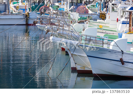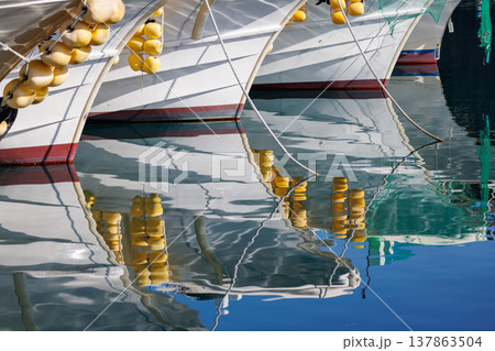 停泊する漁船の船首と美しい水面反射
