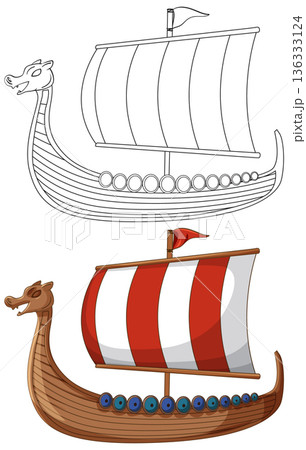 Viking Longship Illustration in Color and Black and White Line Art